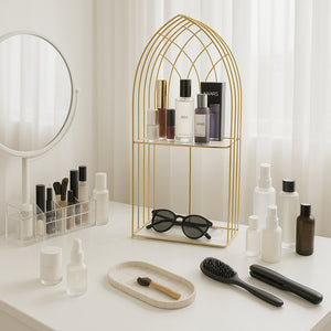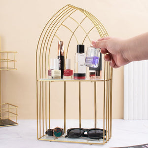 Organize your space with this stunning Artisanal Golden Storage Display Stand! Show off its captivating 3D design and two-floor structure, designed to last for years without fading or rust. It's the ultimate solution to organize any corner of your home - from the bedroom to the bathroom. Transform your space now and enjoy a lifetime of neatness and order!