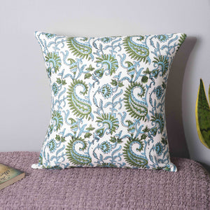 Elevate your space with the Imperial Bloom Pillow Cover, designed with exquisite Mughal-inspired green and blue patterns against a pristine white base. This pillow cover adds a touch of royal charm to your home.