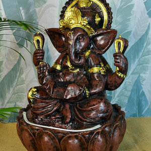 Unique Design: Elegant brown Ganesha water fountain featuring a serene Ganesha sitting with a flowing waterfall, adding a spiritual and calming touch to your space.