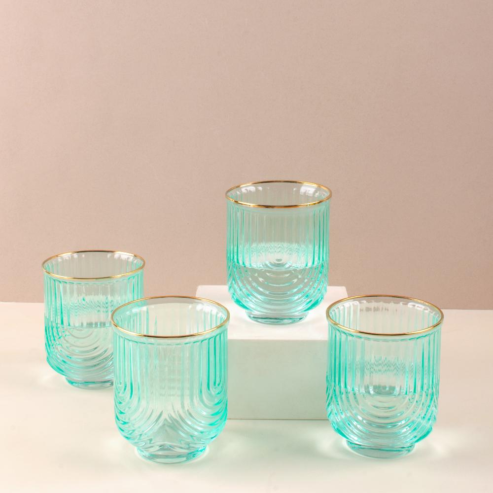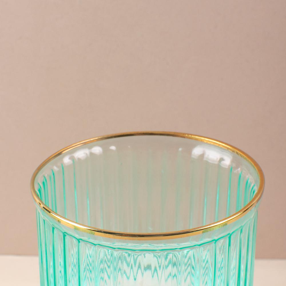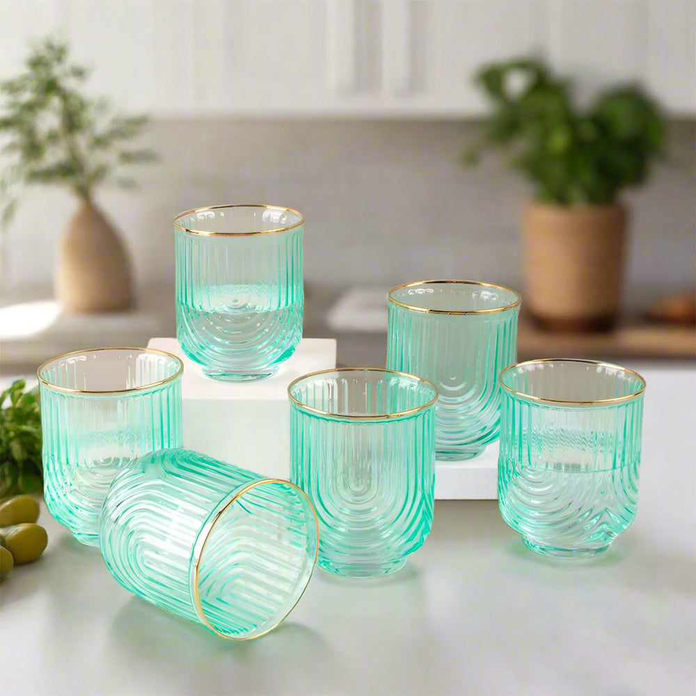 Indulge in luxury with our Verdant Gilded Wave Glass set. The ribbed glass texture and golden rim add a touch of elegance to your drinkware collection. Crafted with premium glass, these glasses are available in sets of 2, 4, or 6. Elevate your dining experience with these exclusive pieces.