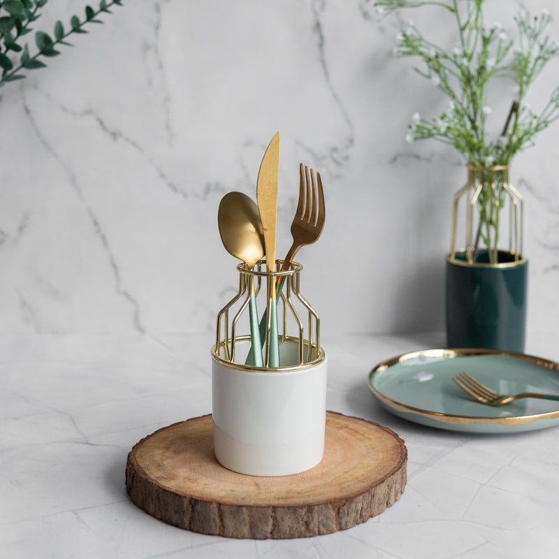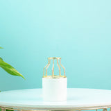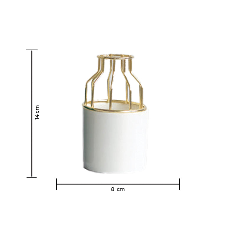 Cylindrical Vase With Gold Metal Cage is perfect for home decor. The decorative vases with golden cage will look beautiful with flowers and will brighten up your sunlit corner, living space, study table, side table, dining table. The unique design of this Nordic accent vase will leave your guests spellbound. It is a handmade ceramic vase. This unique vase for centerpiece is a great gifting idea.