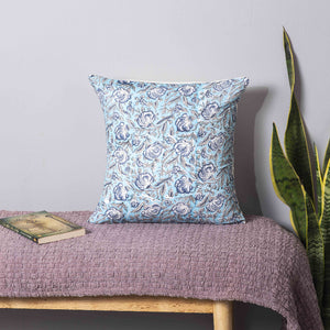 The Azure Blossom Pillow Cover features a calming light blue base, adorned with dark blue and white flowers, and grey stems in delicate threadwork. This elegant design adds a tranquil, soothing touch to any room.