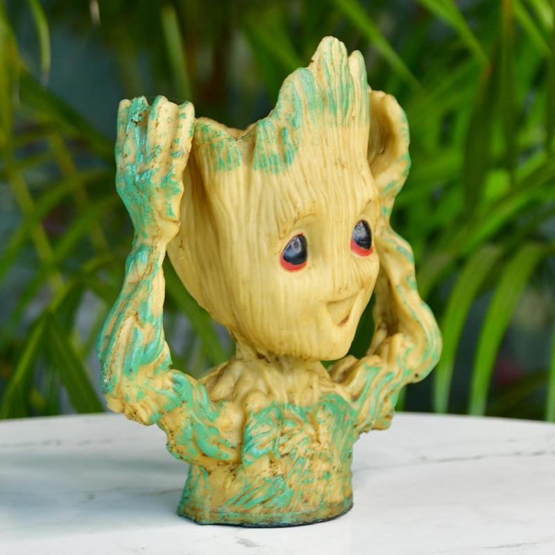 This handcrafted Groot figurine features an animated pose with both hands raised, offering a playful yet functional planter design.