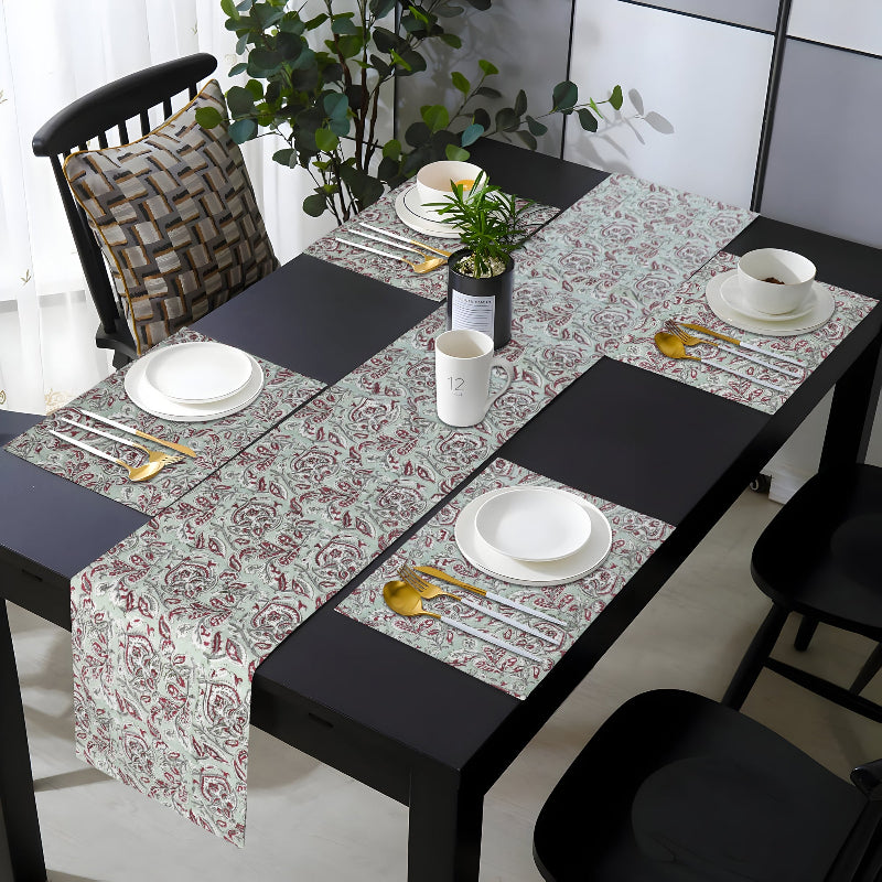 Enhance your dining experience with this elegant paisley table runner and placemat set, designed to bring a sophisticated vintage charm to your table. Featuring intricate paisley patterns in muted tones of green and burgundy, this set adds an exquisite touch to both modern and traditional interiors. A timeless design that elevates your dining space effortlessly. This handcrafted luxury table runner set is perfect for those who love elegant dining aesthetics with a touch of vintage charm.