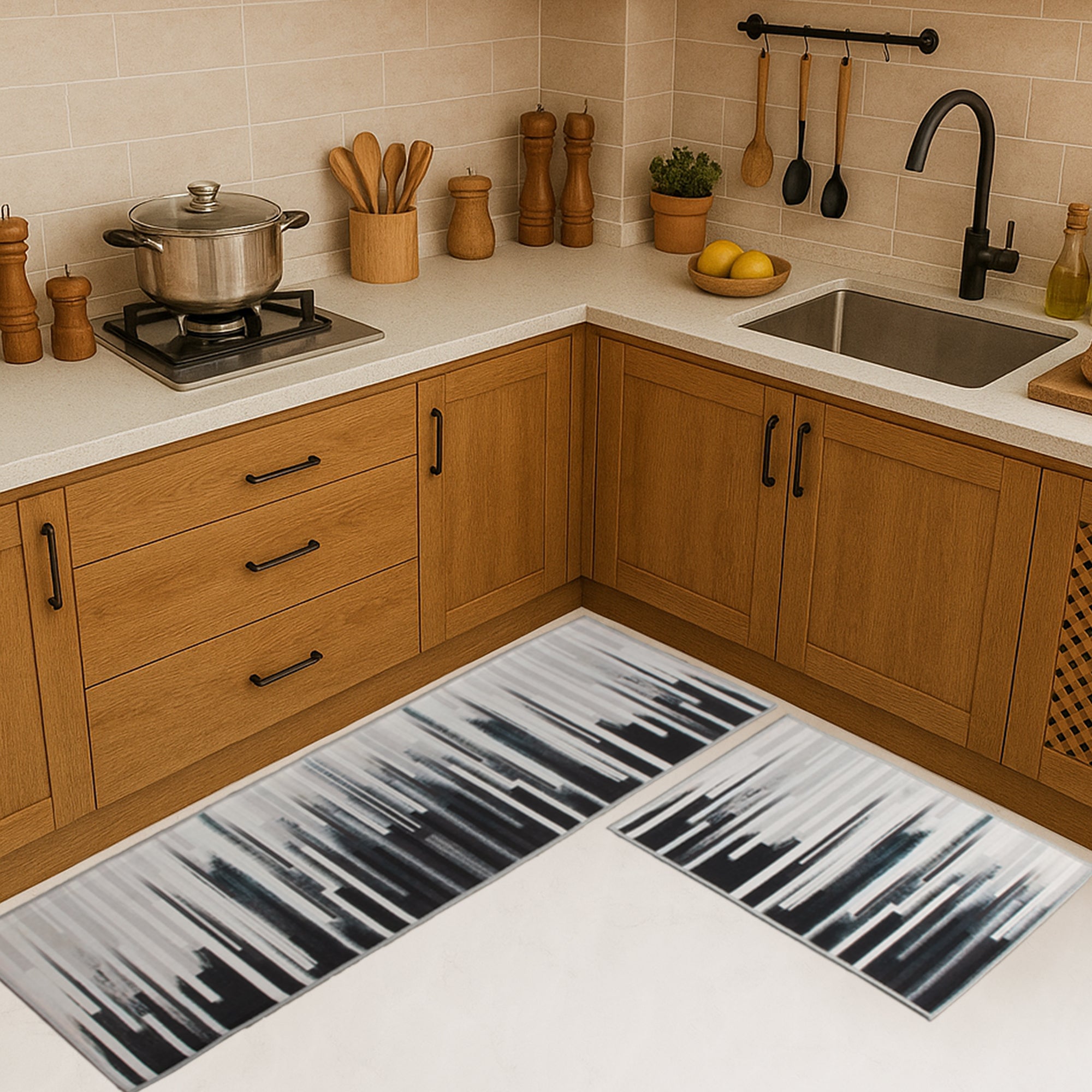 This set of 2 kitchen mats is designed to fit snugly into corner spaces while offering a soft surface for your feet. The easy-to-clean material makes maintenance a breeze. Ideal for modular kitchens, these mats add a stylish and practical touch to your everyday cooking space.