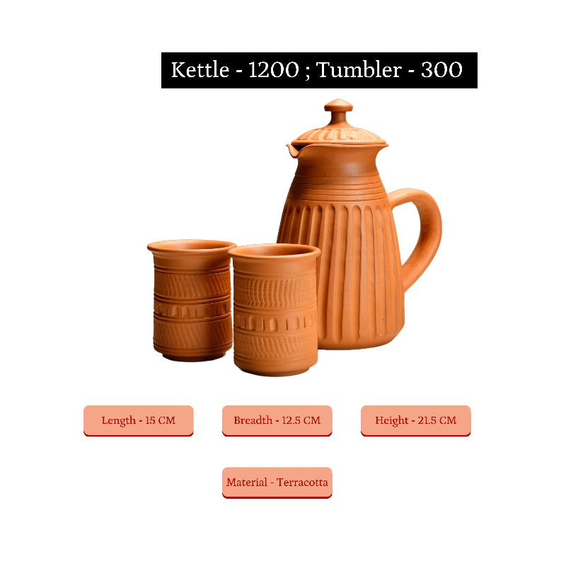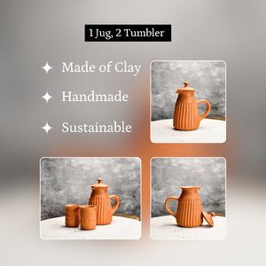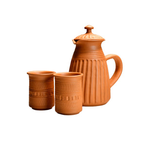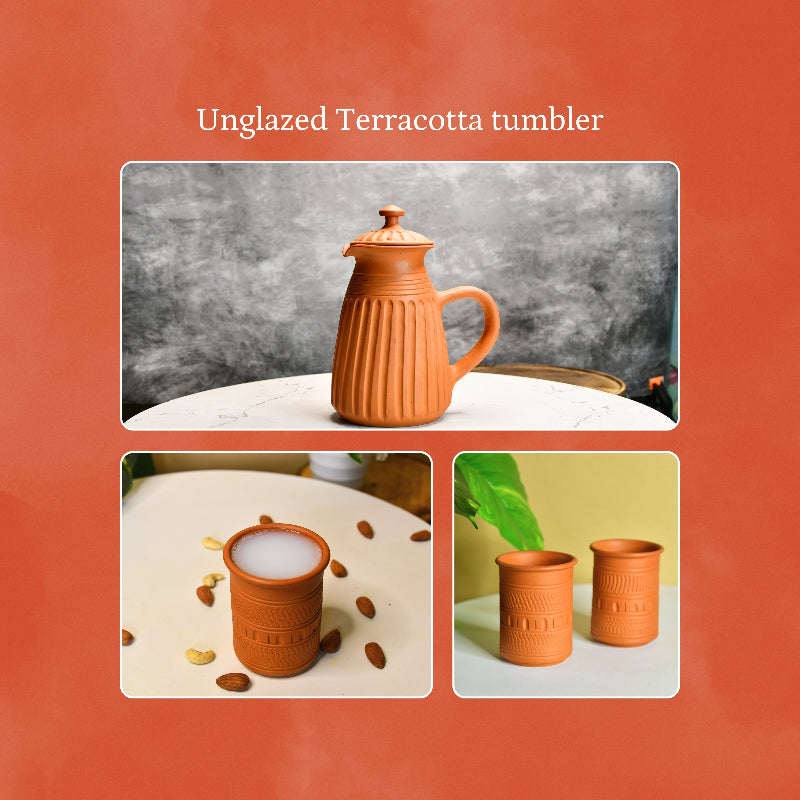 Elegant terracotta jug with linear design and matching tumbler. Ideal for serving naturally cooled water and traditional drinks.