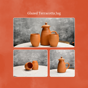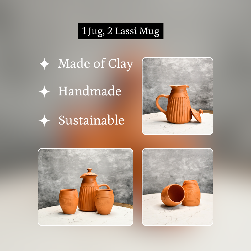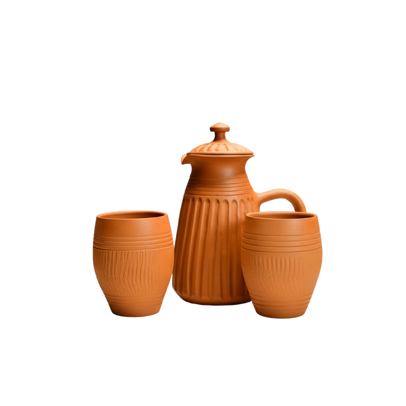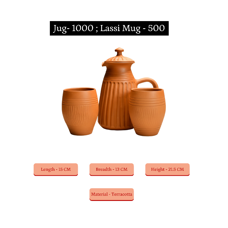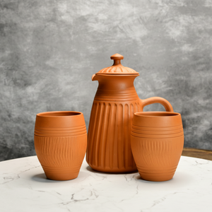 Line‑pattern terracotta jug paired with a lassi mug. Naturally cools beverages while maintaining a stylish handcrafted texture.