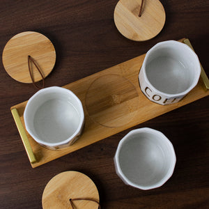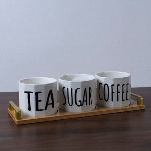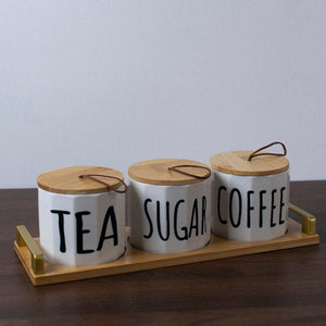 The Brew & Sweeten Canister Set Keep your kitchen essentials organized in style with this charming three-piece canister set designed for tea, sugar, and coffee. Each canister features a secure lid to maintain freshness and keep your favorite beverages and sweeteners at their best. The matching wooden tray brings everything together, creating a cohesive look on your countertop or pantry shelf. Perfect for coffee lovers and tea enthusiasts who appreciate both functionality and a touch of kitchen charm. A delightful addition to any home that celebrates the simple joy of a perfectly brewed cup.