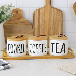 Organize your kitchen essentials in style with this charming three-jar canister set! Perfect for storing cookies, coffee, and tea, each jar features a sleek design that brings a touch of aesthetic appeal to your countertop. The included matching tray keeps everything neatly arranged and ready to display. Whether you're a coffee enthusiast, tea lover, or cookie connoisseur, this versatile set combines functionality with modern elegance—because your pantry staples deserve a home as fabulous as they are!