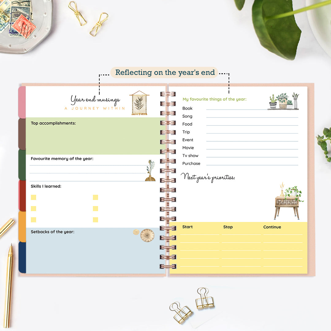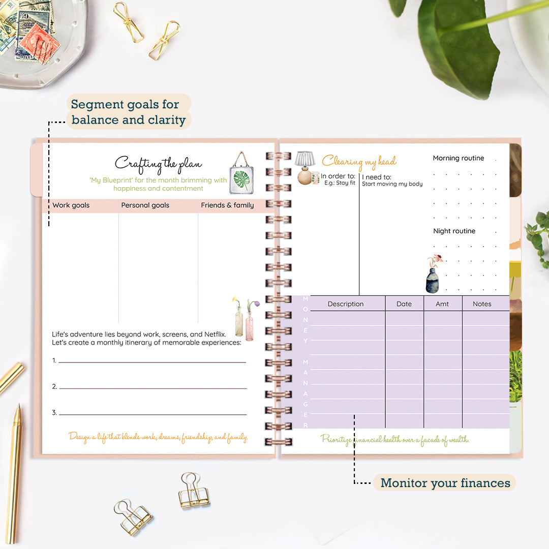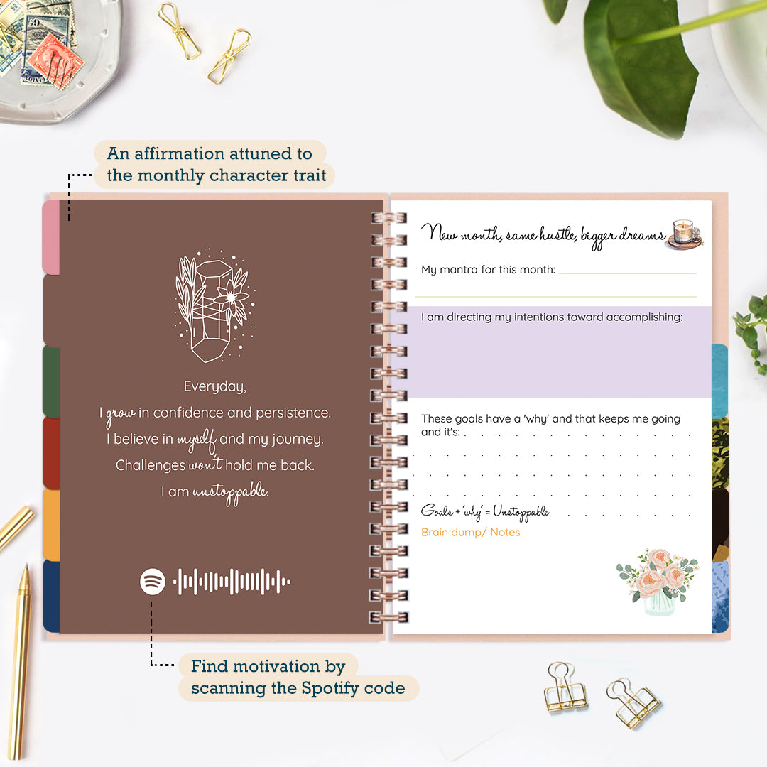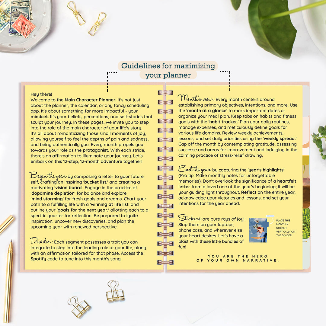 Our Undated Planner is your ultimate canvas for unlocking your inner main character. These planners are your trusty buddies, and each page is a blank slate waiting for your journey and goals. No more waiting around for that "perfect" date – the spotlight is always yours to take. With themes and inspiration that groove with your ever-evolving story, it's time to grab that pen and start scripting your narrative, your way, every single day. Let's make your story awesome!