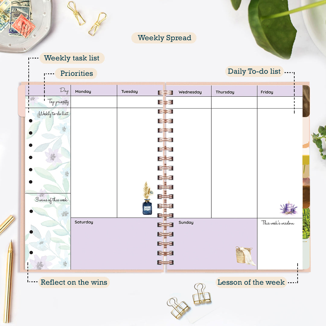 - Weekly spread with day-to day to-do list, priorities, wins and lessons