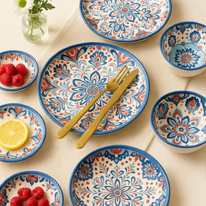 A grand 24 Piece Dinner Set to ensure your crockery collection is on point. This premium crockery set comes with different sizes of bowls and plates. Set the table with this premium dinnerware set when you are having a party or a small get-together. This ceramic dining set consists of 6 pasta bowls, 6 rice bowls, 6 salad plates, and 6 main course plates in beautiful patterns. This 24-piece serve ware set will adhere to all your kitchenware and tableware needs. You may use the rice bowls as soup bowls, the pasta bowls can be used as noodle bowls or salad bowls, and salad plates as snack plates as well. The serveware set will meet all your needs while catering a small house party. This premium ceramic dinnerware is dishwasher safe, microwave oven safe, freezer safe and a great gifting option for a housewarming party, anniversary party, Diwali party or a wedding ceremony.