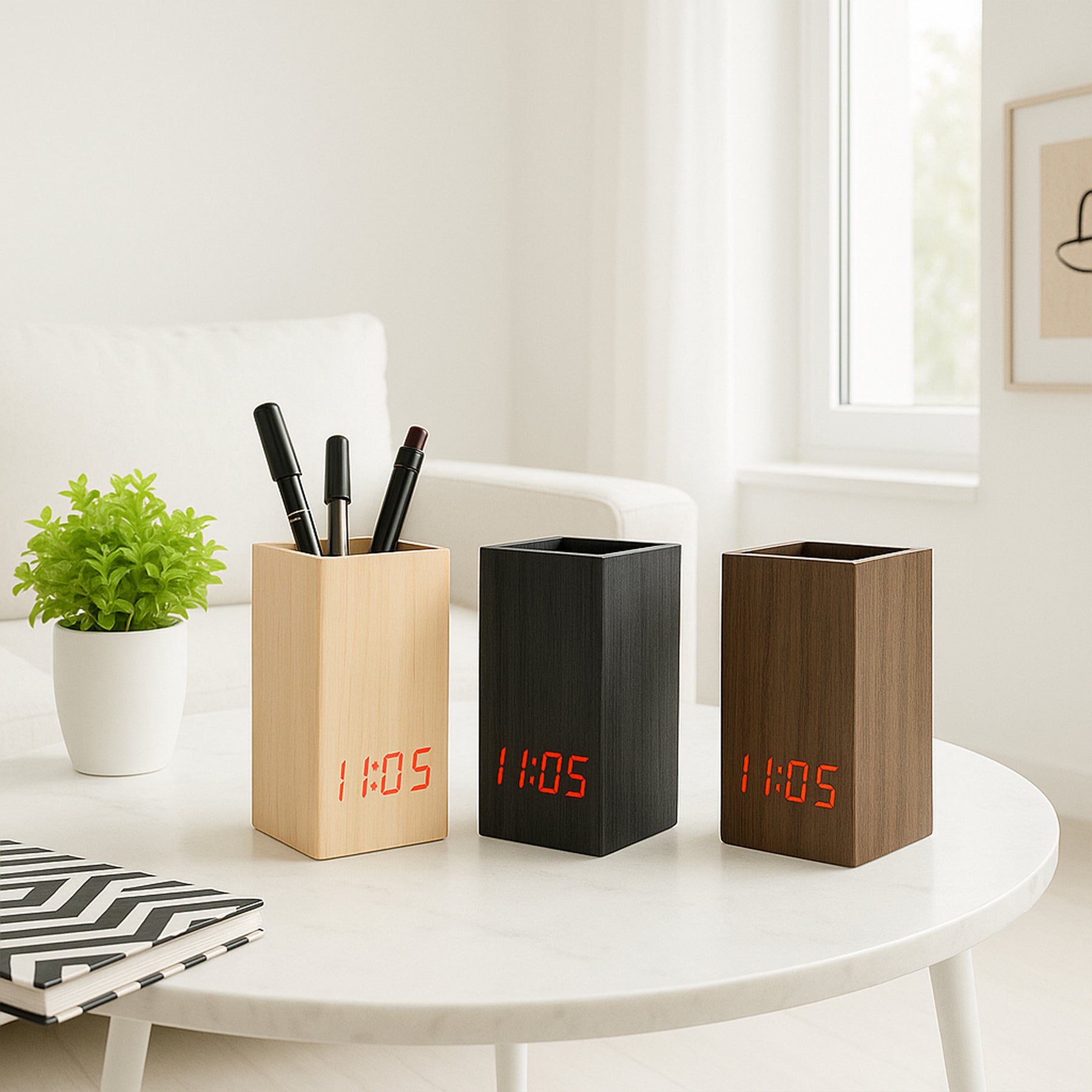 Enhance your workspace with the sophisticated Dynamo Table Clock Cum Pen Stand. This elegant piece combines a digital clock and classic pen stand, featuring dynamic style that will inspire you to work more efficiently. Easy to read time right on your desk, so you can stay productive and on schedule. Add a touch of class to your office!