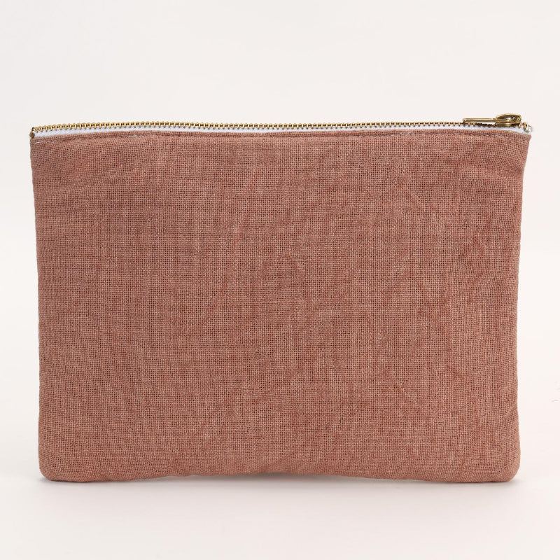 This pouch features a soft, earthy brown fabric adorned with delicate floral embroidery in vibrant hues of pink, orange, and red. The intricate hand-embroidered design adds an elegant touch, making it a perfect blend of minimalism and artistry. Compact and stylish, it is ideal for storing essentials such as cosmetics, stationery, or small personal items. Its sturdy zipper ensures security, while the textured fabric offers a comfortable, rustic charm. A versatile piece, it can seamlessly complement any outfit or occasion.