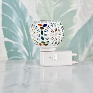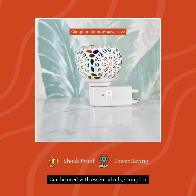 Illuminate your space with the Sowpeace Electric Camphor Lamp, a beautiful mosaic fragrance lamp perfect for essential oils and camphor. This shock-proof, power-saving wall plug-in diffuser is an ideal electric lamp for pooja room and general home decor.